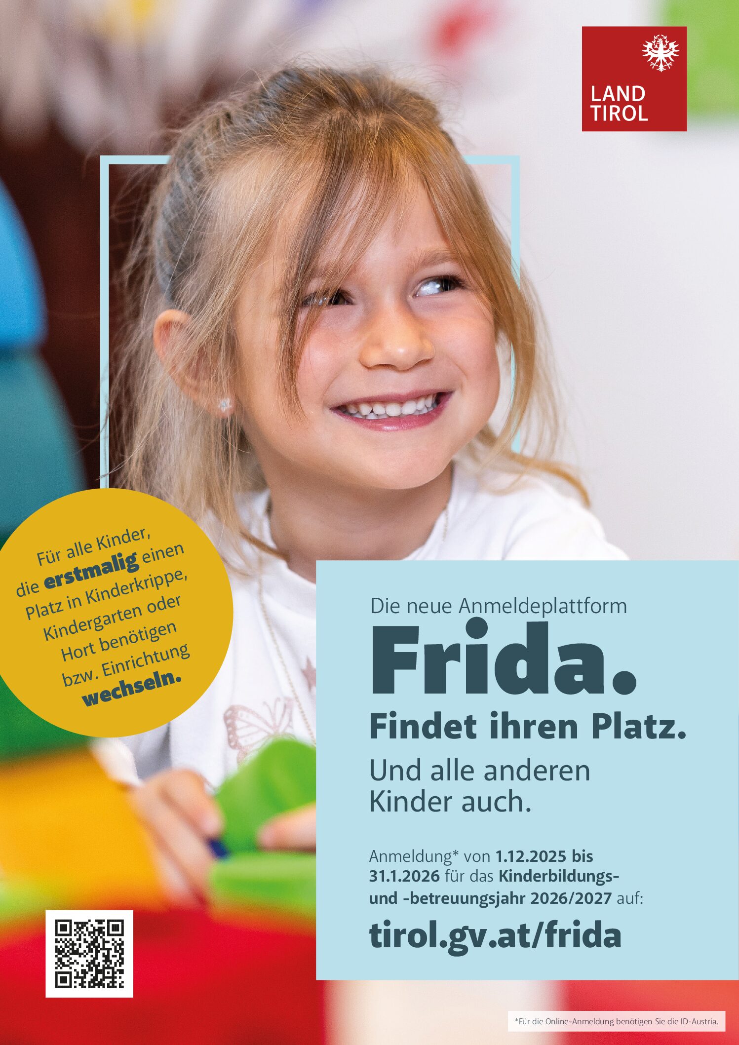 Eine Anmeldung ist von 1. Dezember 2025 bis 31. Jänner 2026 möglich. Unter folgendem Link kann die Anmeldung des Betreuungsbedarfes bequem von zu Hause aus erfolgen: www.tirol.gv.at/frida.